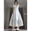Léto Nový Francouzský Styl Elegantní Elegantní Tištěné Tie-Dye Šaty Smysl pro Design Jemné Volánové Ramínko Pas Dlouhé Šaty