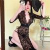 Sexy Lingerie Exotic Customes Black Embroidered Cheongsam High Split See Through Long Dress Night Club Performance Wear Women