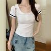 Sweet hot girl color-blocked lapel right shoulder short-sleeved T-shirt women's half-open collar button tight waist short pure lust top summer