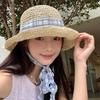 Spring and summer girl atmosphere plaid lace-up woven straw hat sunscreen sunshade seaside vacation wind show face small brim
