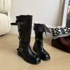 Cowhide Black Handsome Belt Buckle Low Heel High Tube Skinny Locomotive Boots Leather Boots Round Head Knight Boots Women's Boots