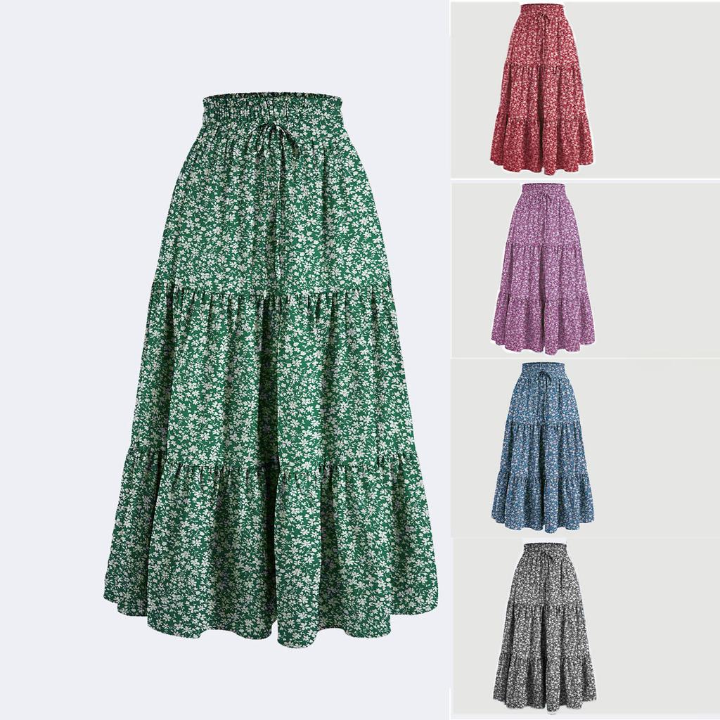 Women'S Boho Vintage Floral Print Maxi Skirt Elastic High Waist Pleated Flowy A Line Long Skirts Toddler Fall Falda Short