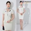 This elegant dark blue short-sleeved suit set is the perfect summer professional attire for front desk roles in hotels and jewelry stores. Crafted from high-quality polyester, it offers both comfort and durability, ensuring a polished look throughout the day. The sophisticated design combines style and functionality, making it an ideal choice for a refined and professional appearance.