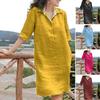 Loose V-neck Solid Colour Dress Women's Vintage Cotton Linen Half Sleeve Mini Dresses