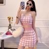 Dame Rutete Korte Topper Sling V-Hals Kort Skjørt Todelt Dress Høy Midje Splitt Mini Skjørt Sommer Tanktopper Skjørt Drakter