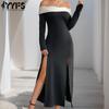 YYFS Women's Fashion Spring Autumn Solid Color Print Long Sleeve Oblique Collar High Waist Casual Dresses