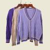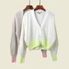 Spring and Autumn V Neck Short Color Stitching Bubble Long Sleeve Single-Breasted Cardigan Outwear Knitting Sweaters Women's Clothing
