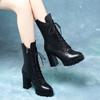 Autumn and winter medium heel short boots women's 2025 new boots pointed high heel lace-up soft leather showing feet thin velvet Martin boots